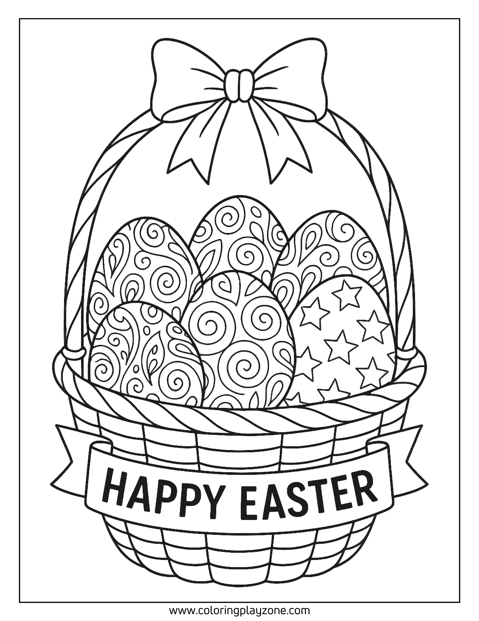 Ornamental Easter Basket with “Happy Easter” Banner Coloring Page